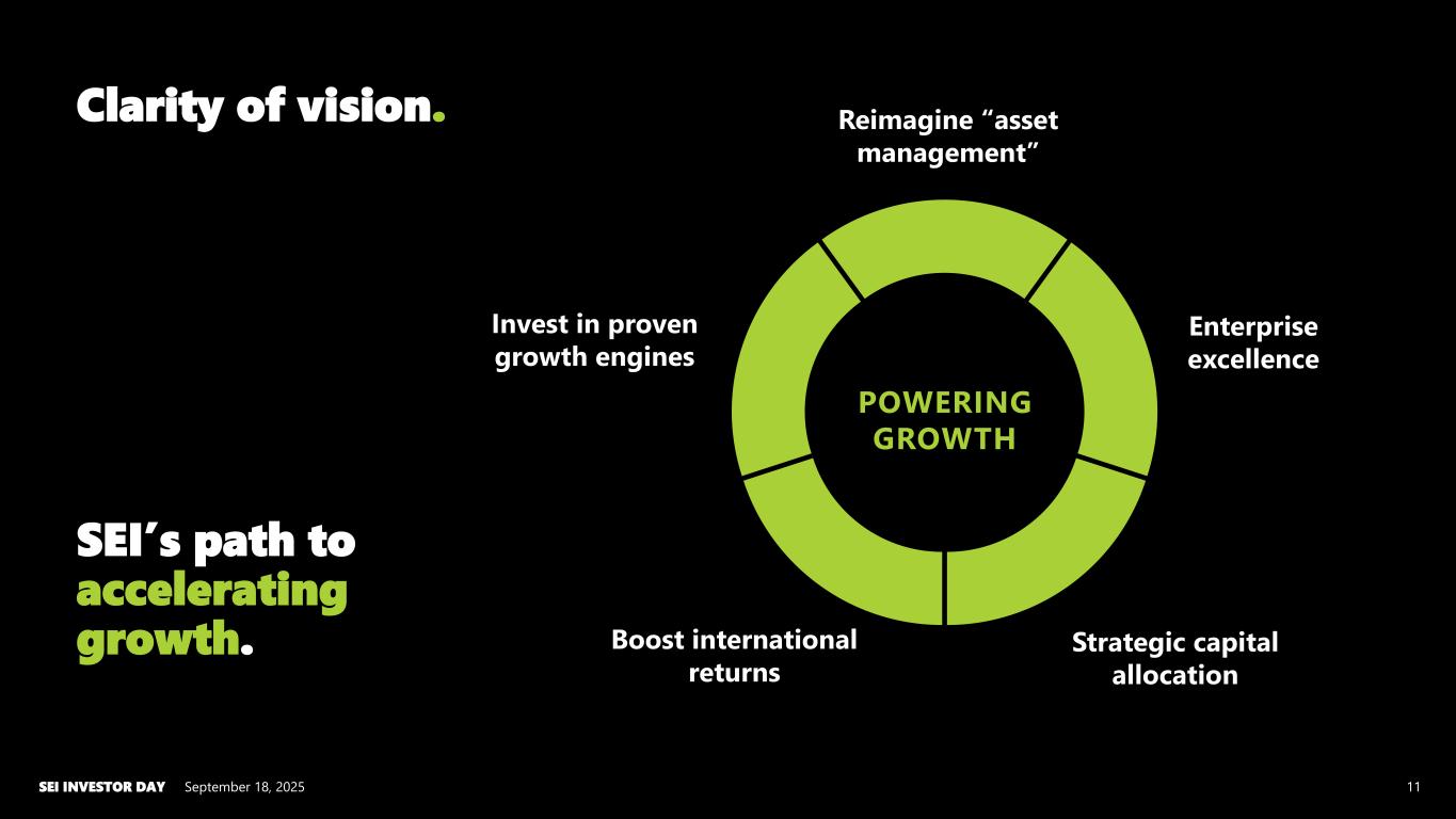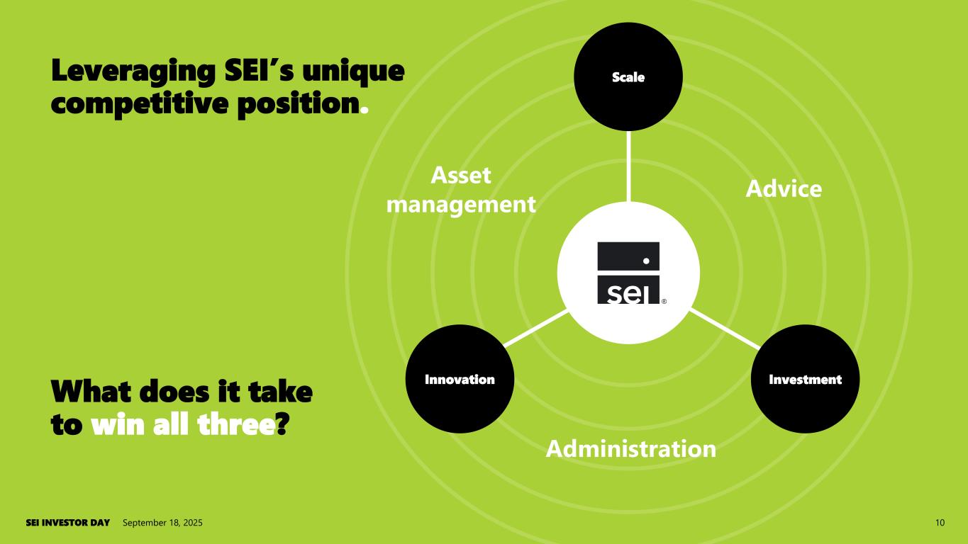 Safe harbor statement. September 18, 2025SEI INVESTOR DAY 2 This presentation contains forward-looking statements within the meaning or the rules and regulations of the Securities and Exchange Commission. In some cases you can identify forward-looking statements by terminology, such as "may," "will," "expect," "believe," ”remain” and "continue" or "appear." Our forward-looking statements include our current expectations as to: • our ability to leverage our market position and the benefits, if any, of such leverage; • our strategies for accelerating growth; • our strategies and ability to grow assets under management; • our plans for achieving operational gains; • our plans for reimagining our asset management business; • our debt and leverage ratios; • the margins that we may achieve in our global businesses; • our investment priorities and the timing of the expenses associated with these investments; • our strategies, methodologies and priorities for capital allocation; • the growth of our earnings per share, net sales events and operating margins; • the future sources and uses of cash; • our strategies for delivering shareholder value; • our operating model and horizontal competencies; • our ability to create a scalable, global talent strategy and the elements of this strategy; • the benefits of our global capabilities center; • the elements of our new business segments and the timing of the effectiveness of new segment reporting; • the opportunities for our business units and our strategies for executing against these opportunities; • the benefits we may derive from executing against our strategic plans; • the strength of our position for the adoption of alternative investments; • the elements of margin expansion and our strategies for achieving these elements; • the industry trends from which we may benefit; • the market dynamics that affect our businesses; • the geographies where we may seek to enter or grow our business or operations and the timing of any such expansions; • our pricing strategies; • the benefits we may derive from assets that we have acquired and the related opportunities for value creation; and • our strategies for identifying future business trends in which we will participate and creating scale in these endeavors. You should not place undue reliance on our forward-looking statements, as they are based on the current beliefs and expectations of our management and subject to significant risks and uncertainties, many of which are beyond our control or are subject to change. Although we believe the assumptions upon which we base our forward-looking statements are reasonable, they could be inaccurate. Some of the risks and important factors that could cause actual results to differ from those described in our forward-looking statements can be found in the "Risk Factors" section of our Annual Report on Form 10-K for the year ended Dec. 31, 2024, filed with the Securities and Exchange Commission. We do not undertake to update any of our forward-looking statements. Past performance does not guarantee future results.