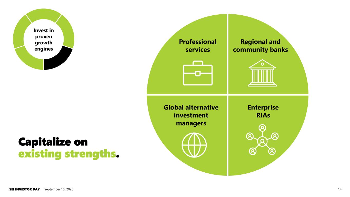 September 18, 2025SEI INVESTOR DAY 14 Capitalize on existing strengths. Global alternative investment managers Regional and community banks Enterprise RIAs Professional services Invest in proven growth engines Invest in proven growth engines