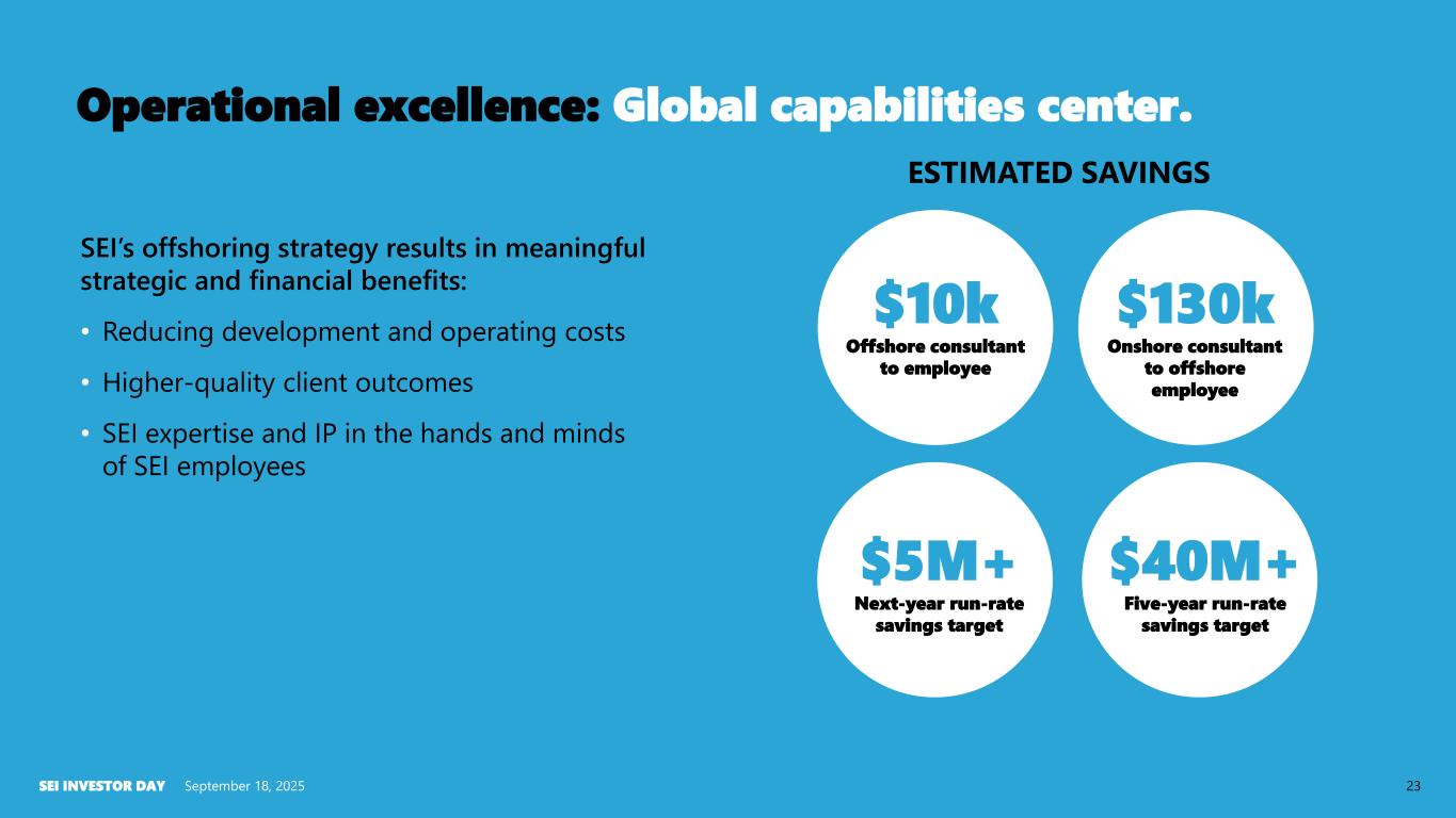 September 18, 2025SEI INVESTOR DAY 23 Operational excellence: Global capabilities center. ESTIMATED SAVINGS $10k Offshore consultant to employee $130k Onshore consultant to offshore employee $5M+ Next-year run-rate savings target $40M+ Five-year run-rate savings target SEI’s offshoring strategy results in meaningful strategic and financial benefits: • Reducing development and operating costs • Higher-quality client outcomes • SEI expertise and IP in the hands and minds of SEI employees