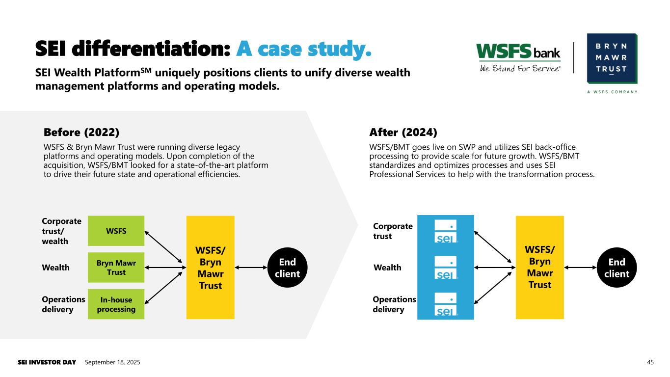 Before (2022) WSFS & Bryn Mawr Trust were running diverse legacy platforms and operating models. Upon completion of the acquisition, WSFS/BMT looked for a state-of-the-art platform to drive their future state and operational efficiencies. SEI differentiation: A case study. September 18, 2025SEI INVESTOR DAY 45 SEI Wealth PlatformSM uniquely positions clients to unify diverse wealth management platforms and operating models. After (2024) WSFS/BMT goes live on SWP and utilizes SEI back-office processing to provide scale for future growth. WSFS/BMT standardizes and optimizes processes and uses SEI Professional Services to help with the transformation process. WSFS/ Bryn Mawr Trust End client WSFS Corporate trust/ wealth Wealth Operations delivery Bryn Mawr Trust In-house processing WSFS/ Bryn Mawr Trust End client Corporate trust Wealth Operations delivery