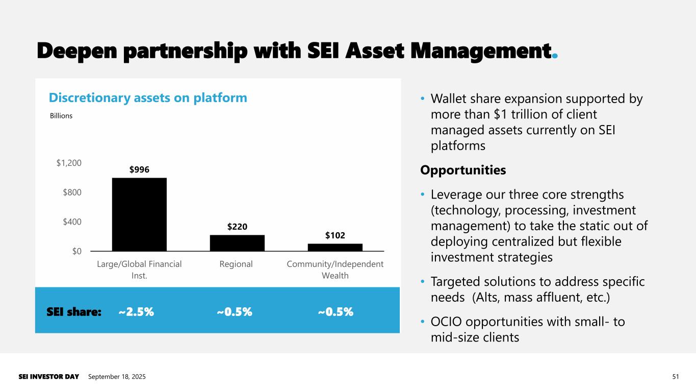 Price holistically. September 18, 2025SEI INVESTOR DAY 70 <$25M $50-$150M $150-$250M $250-$500M >$500M <$500k Higher average fees Missing $500k to $2M $2M to $10M >$10M Lower average fees Average client size Financial advisor total assets Evolved strategy: Move up market • Historical focus on smaller end of advisor and institutional market resulted in uncompetitive pricing at higher end of market • Low incremental costs allow for additional pricing flexibility to match (not beat) best-in-class competition • Focus with larger clients, even at lower fee rates, should enhance profitability. Small clients require significant overhead, offsetting high fee- rate benefit