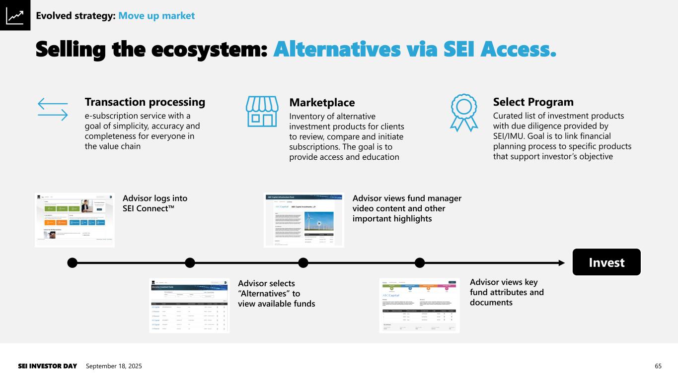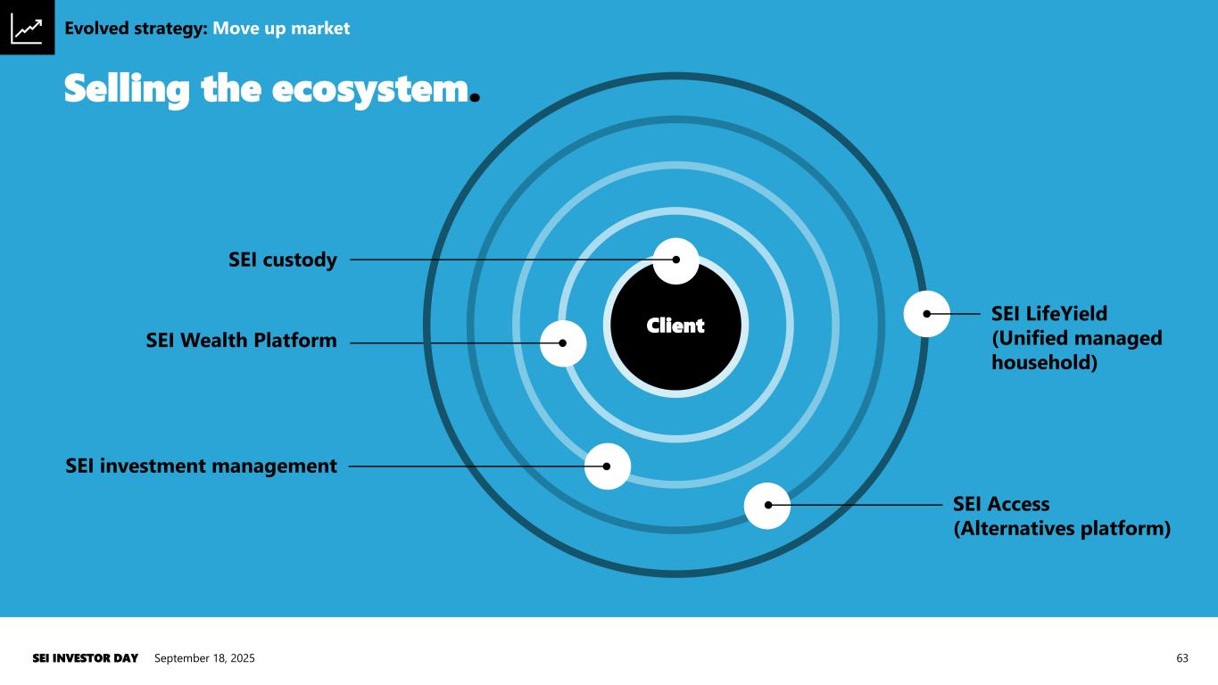 Selling the ecosystem. September 18, 2025SEI INVESTOR DAY 63 SEI Wealth Platform SEI investment management SEI Access (Alternatives platform) SEI LifeYield (Unified managed household) SEI custody Client Evolved strategy: Move up market