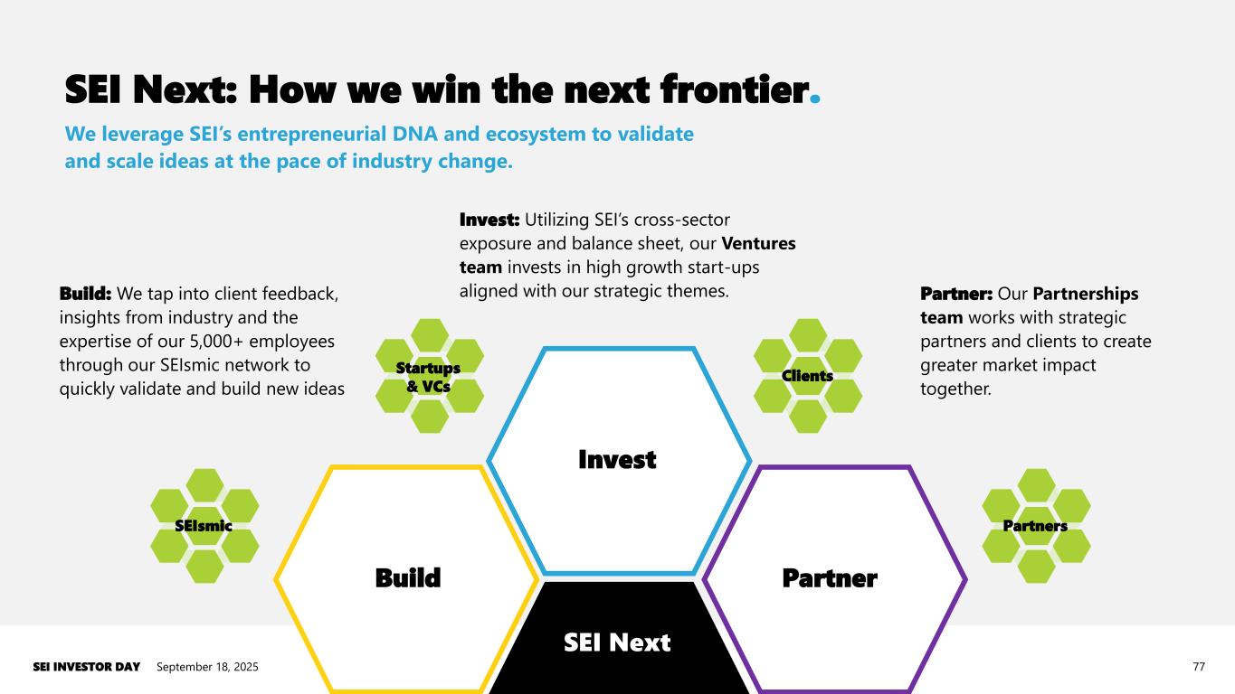 Build: We tap into client feedback, insights from industry and the expertise of our 5,000+ employees through our SEIsmic network to quickly validate and build new ideas Invest: Utilizing SEI’s cross-sector exposure and balance sheet, our Ventures team invests in high growth start-ups aligned with our strategic themes. Partner: Our Partnerships team works with strategic partners and clients to create greater market impact together. We leverage SEI’s entrepreneurial DNA and ecosystem to validate and scale ideas at the pace of industry change. SEI Next: How we win the next frontier. September 18, 2025SEI INVESTOR DAY 77 SEI Next Build Invest Partner SEIsmic Startups & VCs Partners Clients