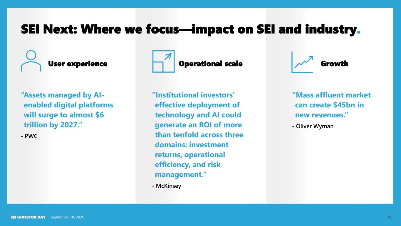 User experience “Assets managed by AI- enabled digital platforms will surge to almost $6 trillion by 2027.” - PWC Operational scale “Mass affluent market can create $45bn in new revenues.” - Oliver Wyman ”Institutional investors’ effective deployment of technology and AI could generate an ROI of more than tenfold across three domains: investment returns, operational efficiency, and risk management.” - McKinsey September 18, 2025SEI INVESTOR DAY 79 SEI Next: Where we focus—impact on SEI and industry. Growth