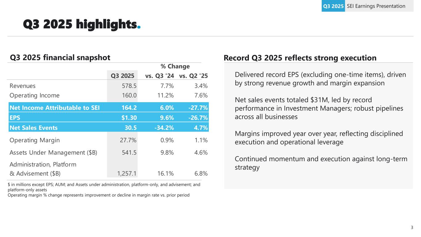 This presentation contains forward-looking statements within the meaning or the rules and regulations of the Securities and Exchange Commission. In some cases you can identify forward-looking statements by terminology, such as "may," "will," "expect," "believe," ”remain” and "continue" or "appear." Our forward-looking statements include our current expectations as to: • our opportunities; • the strength of our pipelines; • our momentum and the benefits of this momentum; • our commitment to disciplined execution, transparent communication, and creating long-term value for our clients and shareholders; • the level of demand for outsourcing and client expansions; • our investment priorities; • the durability of our growth strategy; • the work that new clients will generate to retire legacy systems, execute complex data conversions, and integrate new platforms; • the incremental opportunities for our professional services offerings; • the financial impact of the loss of a previously disclosed at risk client in our Private Banking business and the duration of related deconversions; • the benefits that we and our stakeholders will receive as a consequence of our partnership with Stratos Wealth Management; • the degree to which our AI and tokenization efforts will support efficiency and scalability; • the ability of our integrated approach to break down silos and enable us to scale across segments, capture wallet share, and deliver consistent, repeatable growth; • our commitment to long-term growth, innovation and accountability; • our focus on execution and the benefits of this focus: • when we will receive the benefits, if at all, of the investments we make; • our potential, both short and long-term; • the pace of our sales events in the second half of 2025; • the timing of the closing of our partnership with Stratos Wealth Management and the source of funds for this closing; • our strategic priorities and our ability to execute against these priorities; • the demand for our products and services; • the headwinds that may affect our businesses; • the performance of our various businesses, including the margins and profitability of such businesses and the events that may affect the margins, profitability and growth prospects of these businesses; • the drivers of future revenue, margin and earnings growth; • the benefits, if any, that we or our clients may derive from acquired assets; • our run rate and the stability of the elements of that run rate; • the resiliency of our business; and • the market dynamics affecting our businesses. You should not place undue reliance on our forward-looking statements, as they are based on the current beliefs and expectations of our management and subject to significant risks and uncertainties, many of which are beyond our control or are subject to change. Although we believe the assumptions upon which we base our forward-looking statements are reasonable, they could be inaccurate. Some of the risks and important factors that could cause actual results to differ from those described in our forward-looking statements can be found in the "Risk Factors" section of our Annual Report on Form 10-K for the year ended Dec. 31, 2024, filed with the Securities and Exchange Commission. Past performance does not guarantee future results. Safe Harbor Statement 2 SEI Earnings PresentationQ3 2025