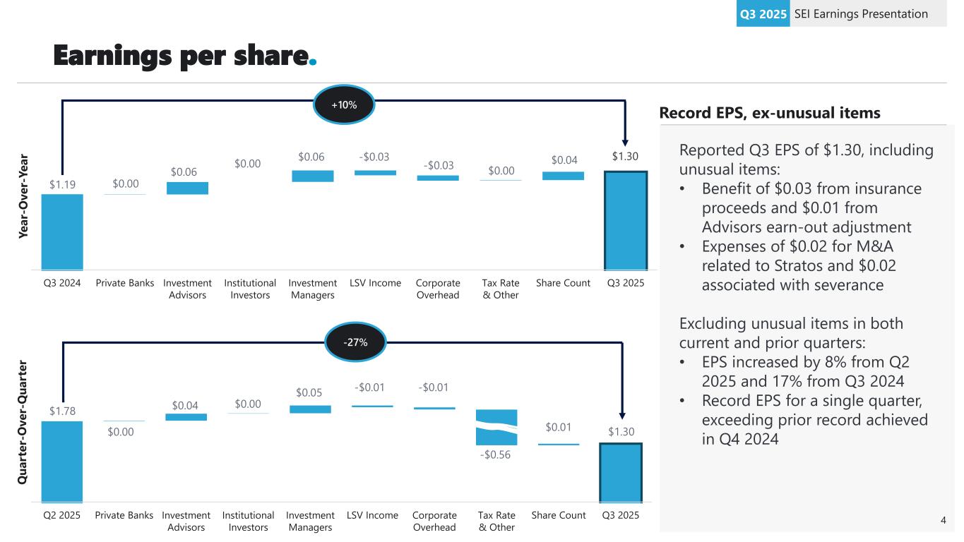 Earnings per share. SEI Earnings PresentationQ3 2025 Reported Q3 EPS of $1.30, including unusual items: • Benefit of $0.03 from insurance proceeds and $0.01 from Advisors earn-out adjustment • Expenses of $0.02 for M&A related to Stratos and $0.02 associated with severance Excluding unusual items in both current and prior quarters: • EPS increased by 8% from Q2 2025 and 17% from Q3 2024 • Record EPS for a single quarter, exceeding prior record achieved in Q4 2024 Record EPS, ex-unusual items Q3 2024 Private Banks Investment Advisors Institutional Investors Investment Managers LSV Income Corporate Overhead Tax Rate & Other Share Count Q3 2025 +10% Q2 2025 Private Banks Investment Advisors Institutional Investors Investment Managers LSV Income Corporate Overhead Tax Rate & Other Share Count Q3 2025 -27% Y e a r- O v e r- Y e a r Q u a rt e r- O v e r- Q u a rt e r 4 $1.19 $0.00 $0.06 $0.00 $0.06 -$0.03 -$0.03 $0.00 $0.04 $1.30 $1.78 $0.00 $0.04 $0.00 $0.05 -$0.01 -$0.01 -$0.56 $0.01 $1.30
