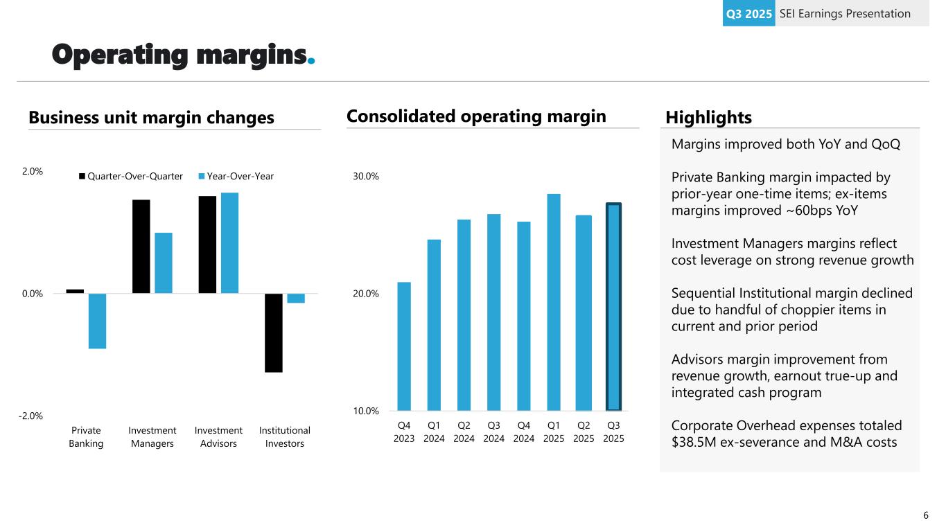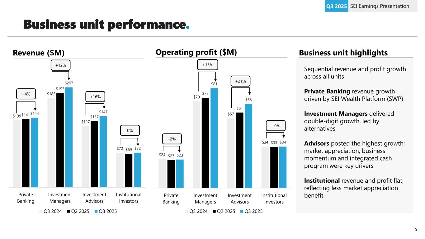 Business unit performance. SEI Earnings PresentationQ3 2025 Revenue ($M) Sequential revenue and profit growth across all units Private Banking revenue growth driven by SEI Wealth Platform (SWP) Investment Managers delivered double-digit growth, led by alternatives Advisors posted the highest growth; market appreciation, business momentum and integrated cash program were key drivers Institutional revenue and profit flat, reflecting less market appreciation benefit Business unit highlightsOperating profit ($M) $139 $185 $127 $72 $141 $195 $137 $69 $144 $207 $147 $72 Private Banking Investment Managers Investment Advisors Institutional Investors Q3 2024 Q2 2025 Q3 2025 $24 $70 $57 $34 $23 $73 $61 $33 $23 $81 $68 $34 Private Banking Investment Managers Investment Advisors Institutional Investors Q3 2024 Q2 2025 Q3 2025 +4% +12% +16% 0% -2% +15% +21% +0% 5