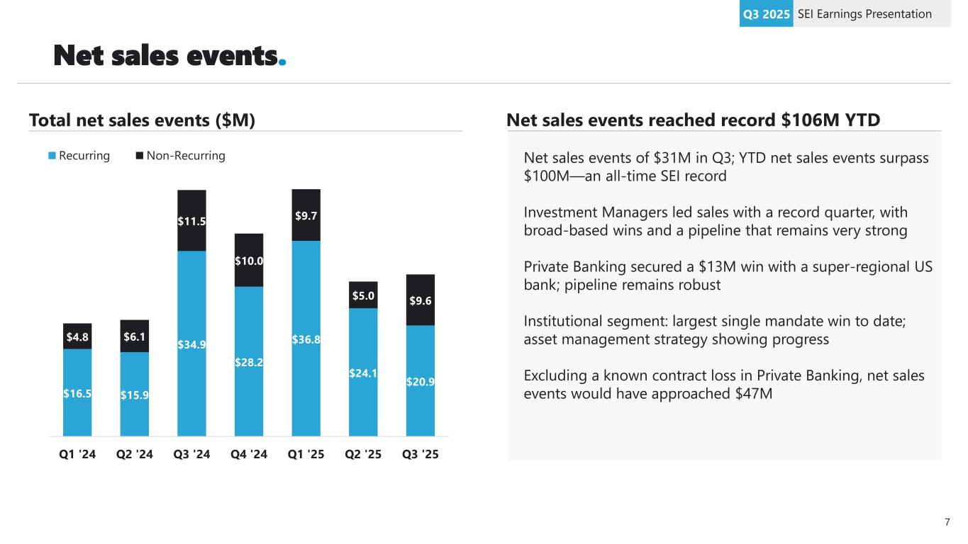 Net sales events. SEI Earnings PresentationQ3 2025 $16.5 $15.9 $34.9 $28.2 $36.8 $24.1 $20.9 $4.8 $6.1 $11.5 $10.0 $9.7 $5.0 $9.6 Q1 '24 Q2 '24 Q3 '24 Q4 '24 Q1 '25 Q2 '25 Q3 '25 Recurring Non-Recurring Total net sales events ($M) Net sales events of $31M in Q3; YTD net sales events surpass $100M—an all-time SEI record Investment Managers led sales with a record quarter, with broad-based wins and a pipeline that remains very strong Private Banking secured a $13M win with a super-regional US bank; pipeline remains robust Institutional segment: largest single mandate win to date; asset management strategy showing progress Excluding a known contract loss in Private Banking, net sales events would have approached $47M Net sales events reached record $106M YTD 7
