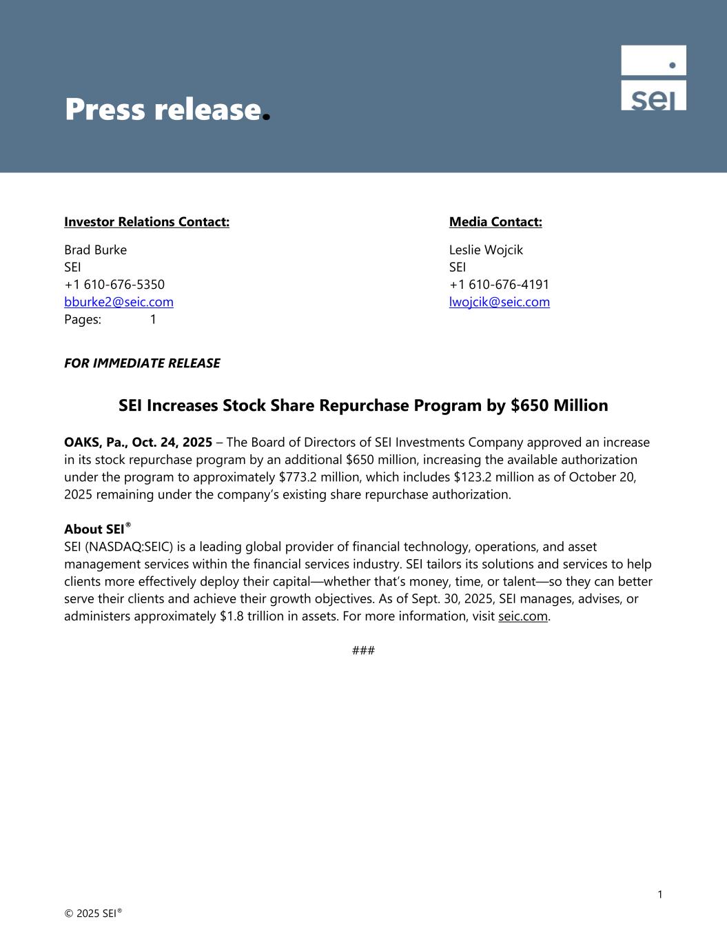 © 2025 SEI® 1 Investor Relations Contact: Media Contact: Brad Burke Leslie Wojcik SEI SEI +1 610-676-5350 +1 610-676-4191 bburke2@seic.com lwojcik@seic.com Pages: 1 FOR IMMEDIATE RELEASE SEI Increases Stock Share Repurchase Program by $650 Million OAKS, Pa., Oct. 24, 2025 – The Board of Directors of SEI Investments Company approved an increase in its stock repurchase program by an additional $650 million, increasing the available authorization under the program to approximately $773.2 million, which includes $123.2 million as of October 20, 2025 remaining under the company’s existing share repurchase authorization. About SEI® SEI (NASDAQ:SEIC) is a leading global provider of financial technology, operations, and asset management services within the financial services industry. SEI tailors its solutions and services to help clients more effectively deploy their capital—whether that’s money, time, or talent—so they can better serve their clients and achieve their growth objectives. As of Sept. 30, 2025, SEI manages, advises, or administers approximately $1.8 trillion in assets. For more information, visit seic.com. ### Press release.